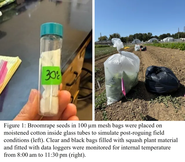For growers facing broomrape infestations, this approach could complement existing handweeding efforts and reduce the long-term seedbank burden. While more work is needed to confirm the relationship between internal bag temperature and seed kill under varied field conditions, this method provides a promising, practical tool for reducing broomrape seed viability after removal from the crop.