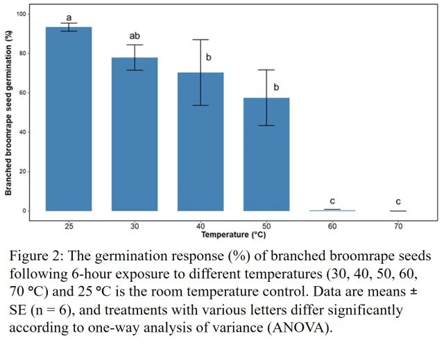 Results from the heat experiment in the lab showed that branched broomrape seed germinability decreased as incubation temperature increased from 30 °C (86 °F) to 50 °C (122 °F), and no germination was observed when seeds were exposed to temperatures above 60 °C (140 °F) for six hours (Figure 2).