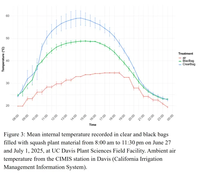 To evaluate the temperature conditions that can realistically be achieved and sustained in the field—and for how long—an experiment was conducted in the outdoor environment at UC Davis Plant Sciences Field Facility near Davis. Temperatures were monitored from 8 am to 11:30 pm in plastic bags filled with fresh squash leaf and vine material in place of broomrape plant material for humidity and heat retention. Two types of bags were used: clear bag (Autoclave bag 24*36 inches, 2mm) and black bags (15 gallon ‘Tough Guy’ can liner). Bags were sealed, and one Kestrel DROP D2 Bluetooth Data Logger was placed inside each bag to record internal temperature (figure 1-right). Ambient air temperature data recorded from the CIMIS station in Davis (California Irrigation Management Information System) were used for comparison purposes. Data were collected from two replicates under each condition on June 27 and an additional two on July 1, 2025.