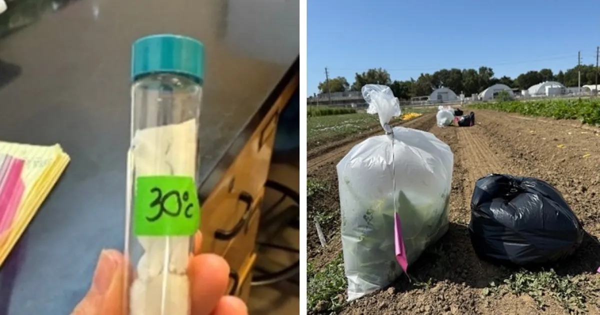 The thermal response part of this experiment was conducted in the broomrape-designated laboratory at UC Davis in 2025 to determine temperatures lethal for broomrape seed germinability. Broomrape seeds were sealed in fine mesh nylon bags (100 microns) and placed on top of a moistened half cotton ball containing 2 mL of distilled water inside a glass tube, simulating conditions similar to those experienced by bagged plant material hand-rogued from infested fields (figure 1-left). The tubes were placed in a temperature-controlled oven for 6 hours. Treatments included constant temperatures of 30 °C (86 °F), 40 °C (104 °F), 50 °C (122 °F), 60 °C (140 °F), and 70 °C (158 °F). Room temperature (25 °C [77 °F]) served as the untreated control. Each treatment included three replicates, and the entire experiment was conducted twice.