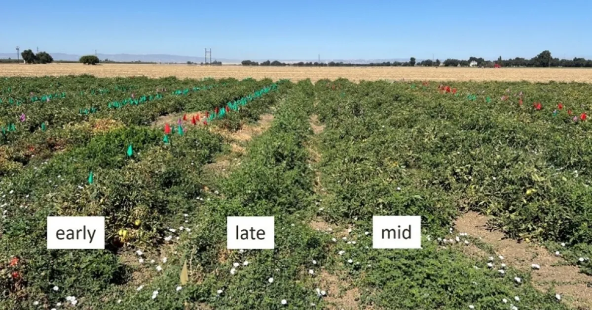 Figure 1. Visual comparison of branched broomrape emergence under different transplanting dates (clusters within 120-ft plots are marked with flags) in processing tomato in a field experiment conducted near Woodland, CA, in 2024.