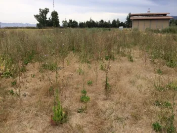 The pasture was a horse pasture for many years, but the most recent previous owners used it as a llama pasture. The water table is high in the pasture as San Juan Creek is located just on other side of fence. The three primary problem plants in the pasture are cheeseweed (Malva parviflora), bristly ox-tongue (Helminthotheca echioides), and foxtail (Hordeum murinum). Desirable species in the pasture include perennial rye and Harding grass. The Cents do not have animals in the pasture year-round, but use targeted goat grazing during the growing season to help achieve their vegetation management goals.