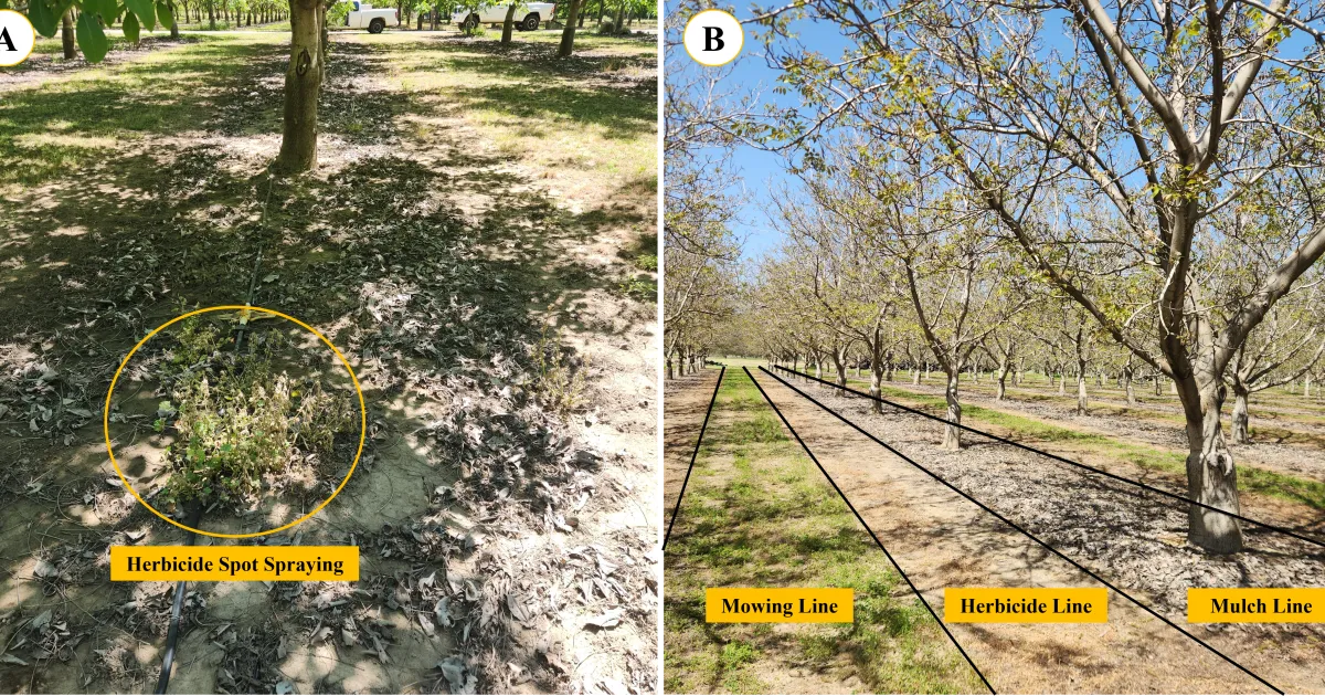 Organic and Conventional walnut growers in Lake County, CA, have implemented walnut leaf mulch for weed management successfully, as shown in the following examples. In organic farming systems, growers have reported a reduction in the number of mowings in the tree rows. Growers have also reported the benefits of this integrated weed management practice in conventional farming systems. As a result, conventional growers were able to reduce the volume of herbicide applications by adopting spot applications (Fig. 6A) or by projecting the herbicide spray line outside the mulch line/tree rows (Fig. 6B). In particular, the strategy of projecting the herbicide spray line away from the tree rows may bring several benefits, such as reducing the number of mowings in the middle, mitigating the risks of herbicide uptake by the trees, and reducing the potential risks of tree trunk damage due to overreliance on a number of herbicide sprays over time.