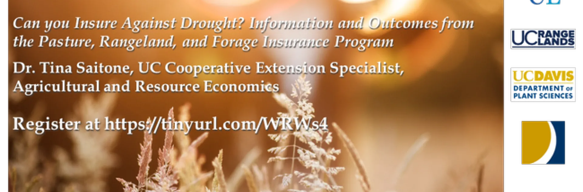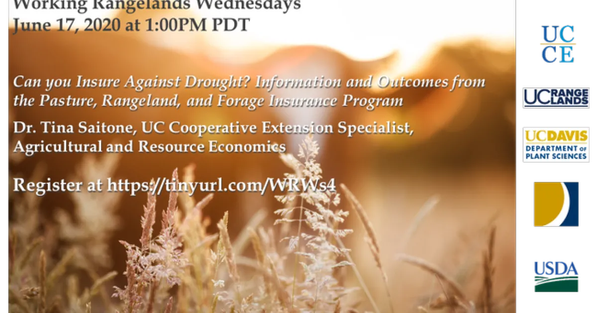 Join us for our next webinar on Wednesday, June 17th at 1pm PDT, which will feature Dr. Tina Saitone, CE Specialist in Agricultural and Resource Economics, presenting "Can you Insure Against Drought? Information and Outcomes from the Pasture, Rangeland, and Forage Insurance Program".