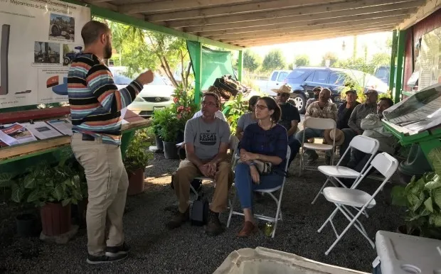 Arthur Levine, left, programs manager for Huerta del Valle, leads an Inland Empire Resource Conservation District farmers' workshop in Chino Sept. 20, 2019. In the front row are Adam Wagner and Jillian Kowalczuk of Rotten Apple Farms. (Photo by Crystal Valenzuela, Inland Empire Resource Conservation District)