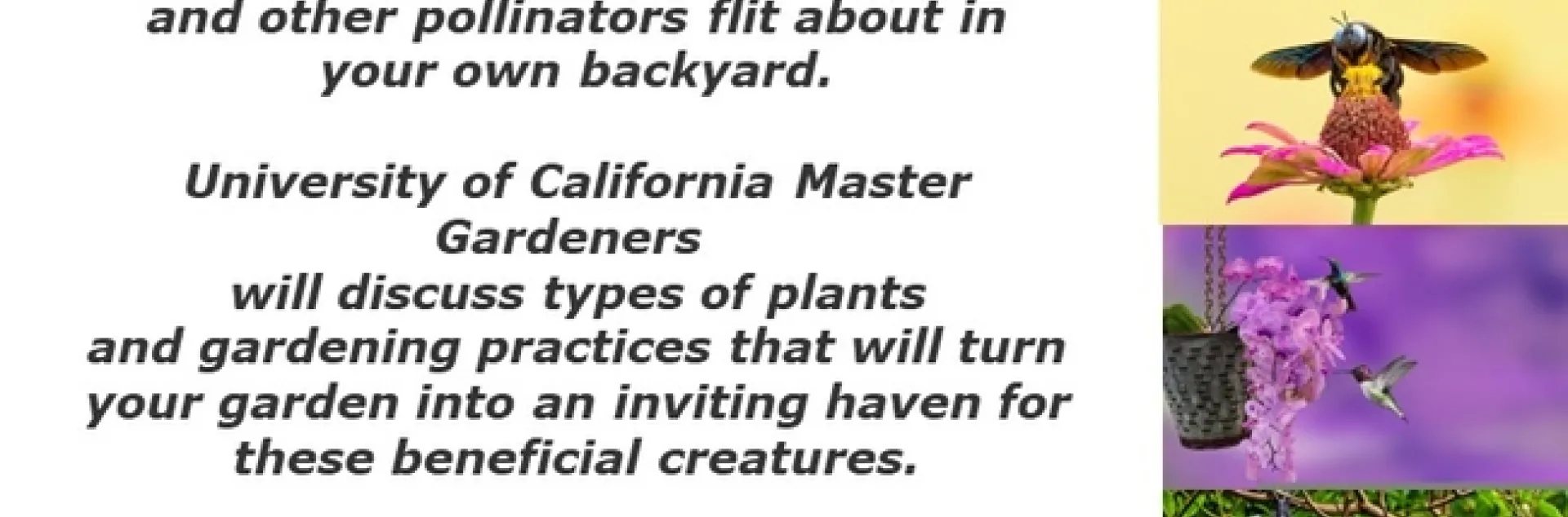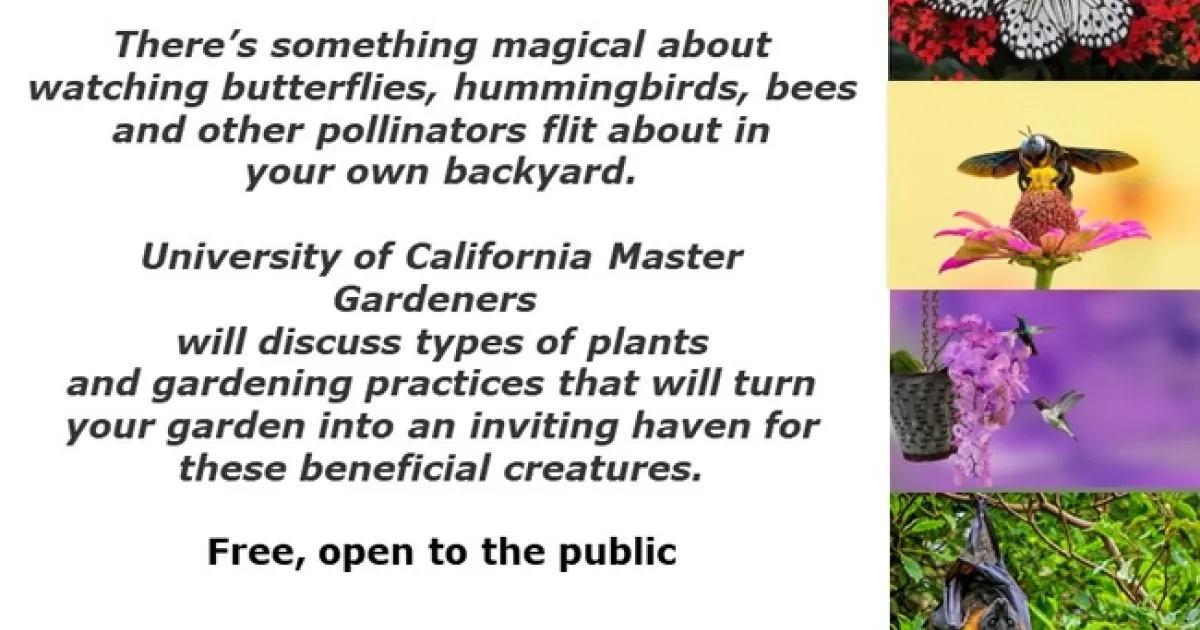 There's something magical about watching butterflies, hummingbirds, bees and other pollinators flit about in your own backyard. University of California Master Gardeners will discuss types of plants and gardening practices that will turn your garden into an inviting haven for these beneficial creatures.