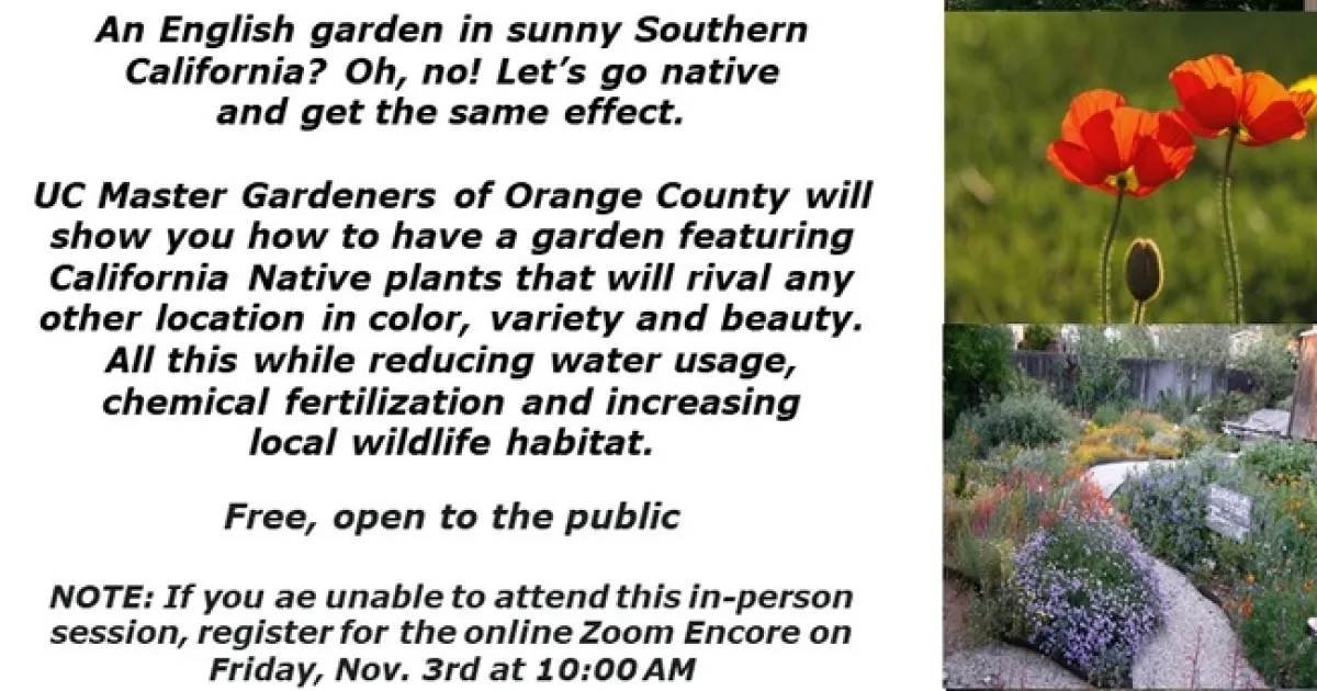 An English garden in sunny Southern California? Oh, no! Let's go native and get the same effect. UC Master Gardeners of Orange County will show you how to have a garden featuring California Native plants that will rival any other location in color, variety and beauty.
