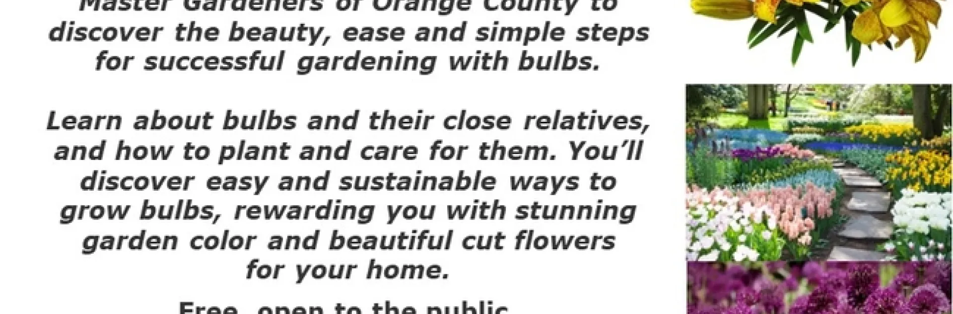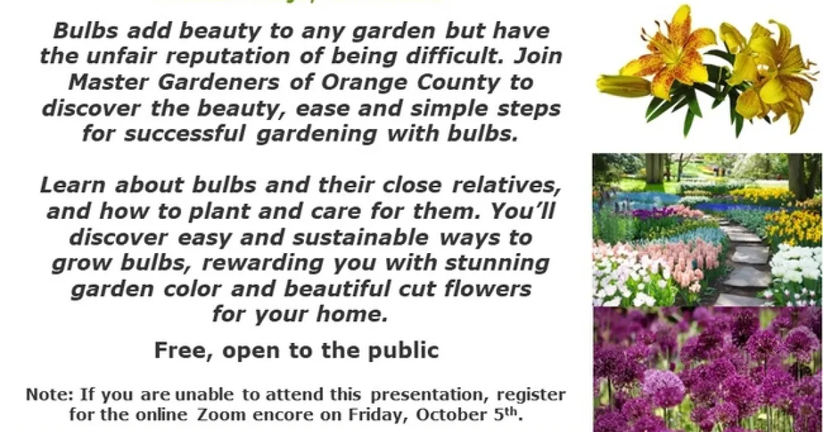 Bulbs add beauty to any garden but have the unfair reputation of being difficult. Join Master Gardeners of Orange County to discover the beauty, ease and simple steps for successful gardening with bulbs. Learn about bulbs and their close relatives, and how to plant and care for them.