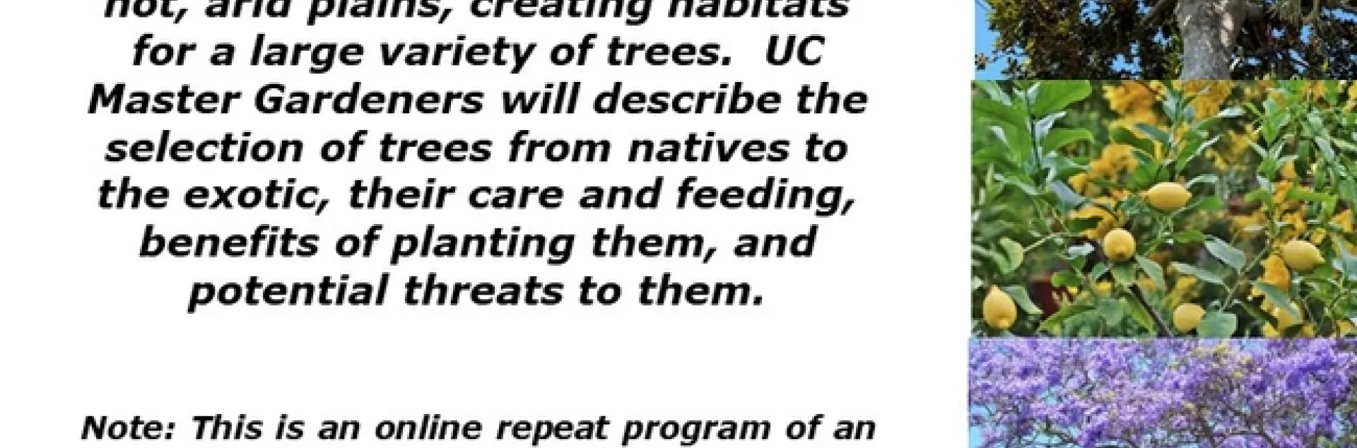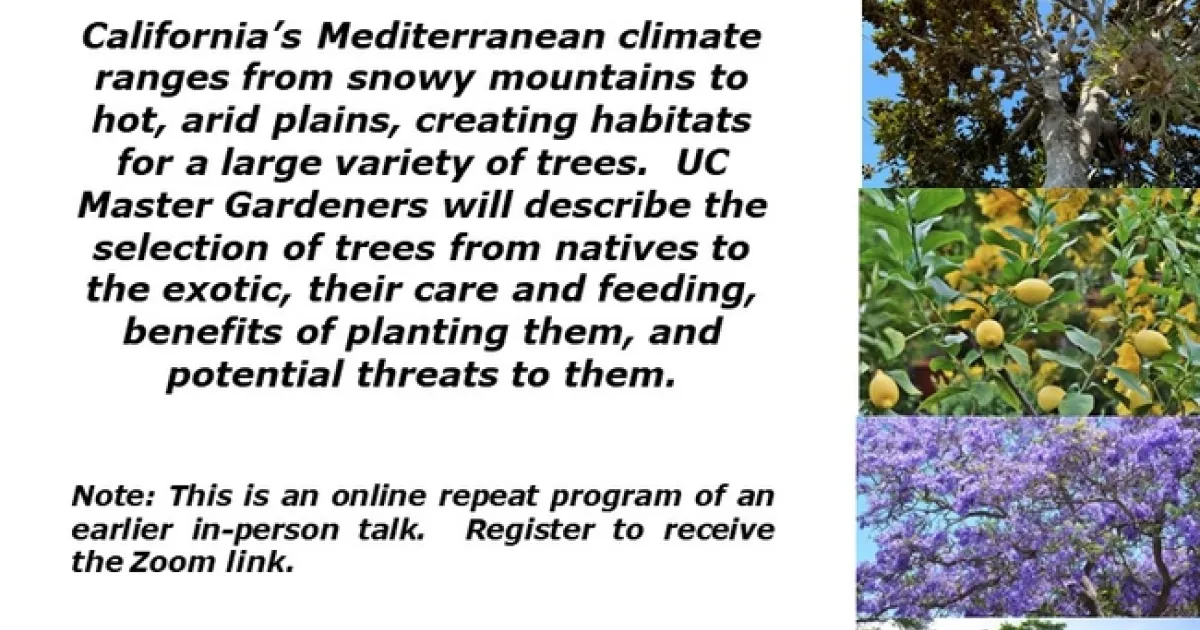 California's Mediterranean climate ranges from snowy mountains to hot, arid plains, creating habitats for a large variety of trees. We will describe the selection of trees from natives to the exotic, their care and feeding, benefits of planting them, and potential threats to them.