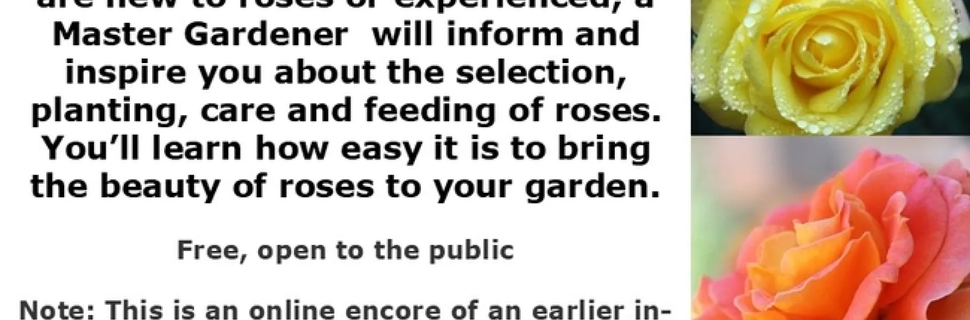 Roses bring beauty, fragrance, and romance into our lives. Whether you are new to roses or experienced, a Master Gardener will inform and inspire you about the selection, planting, care and feeding of roses.