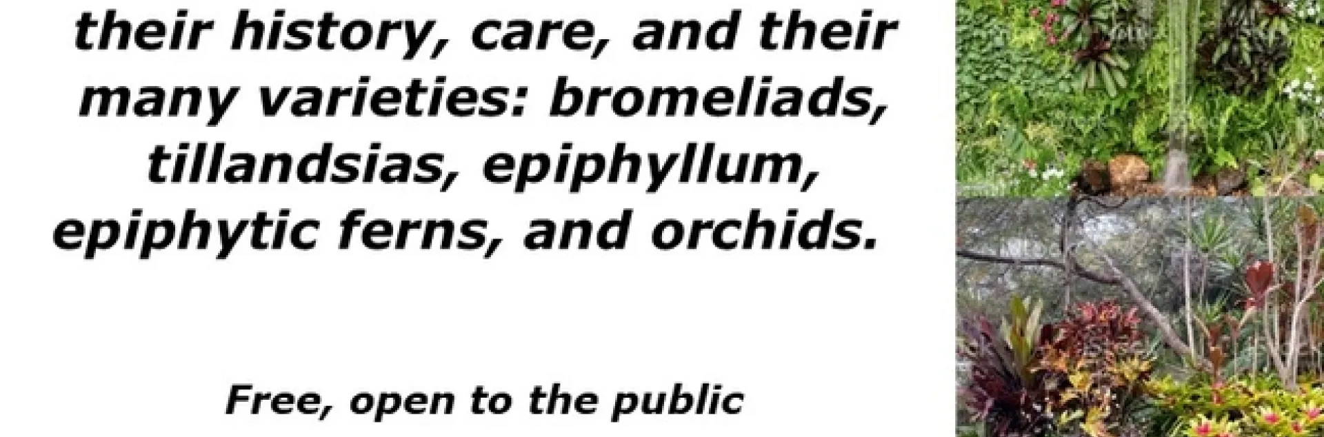November 5, 2024 Print Take an adventure into the world of epiphytes! Learn their history, care, and their many varieties: bromeliads, tillandsias, epiphyllum, epiphytic ferns, and orchids. Click the image to learn more and visit our Classes and Events Calendar page.