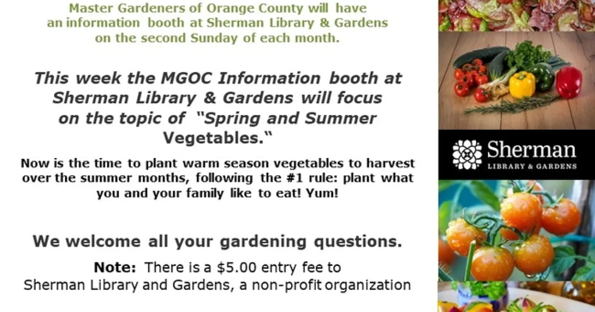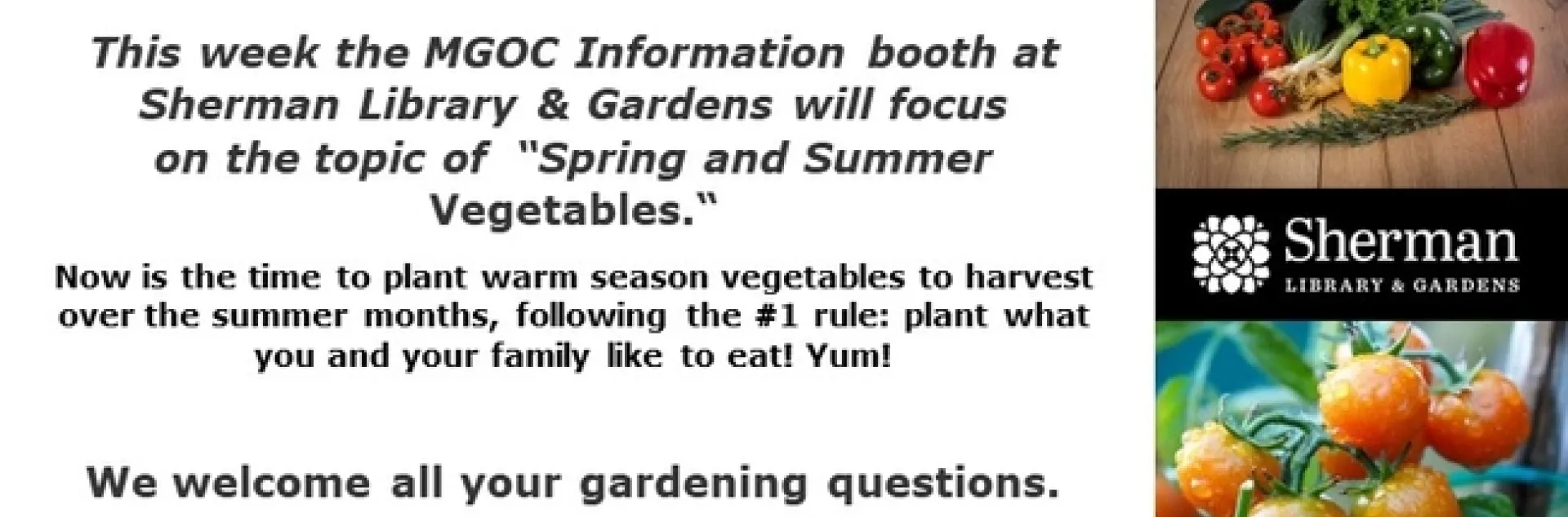 We will have an information booth at Sherman Library & Gardens on the second Sunday of each month. This week the MGOC Information booth at Sherman Library & Gardens will focus on the topic of “Spring and Summer Vegetables."