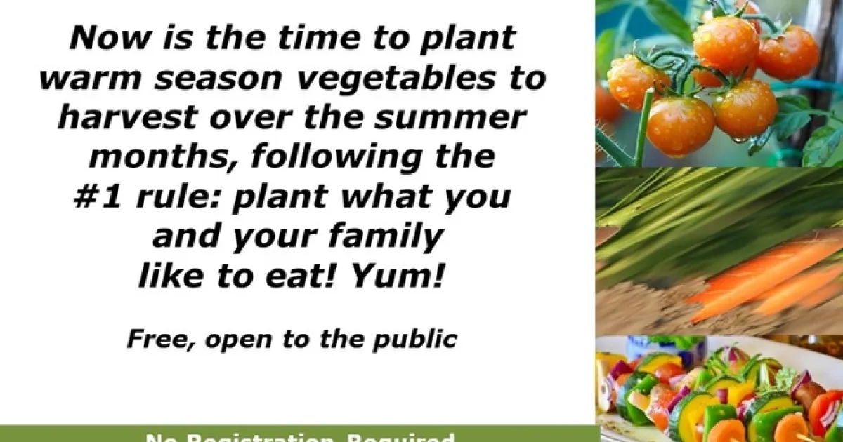 March 11, 2024 Print Now is the time to plant warm season vegetables to harvest over the summer months, following the #1 rule: plant what you and your family like to eat! Yum! Click the image to learn more and visit our Classes and Events Calendar page.