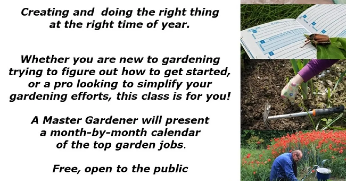 Creating and doing the right thing at the right time of year. Whether you are new to gardening trying to figure out how to get started, or a pro looking to simplify your gardening efforts, this class is for you! A Master Gardener will present a month-by-month calendar of the top garden jobs.