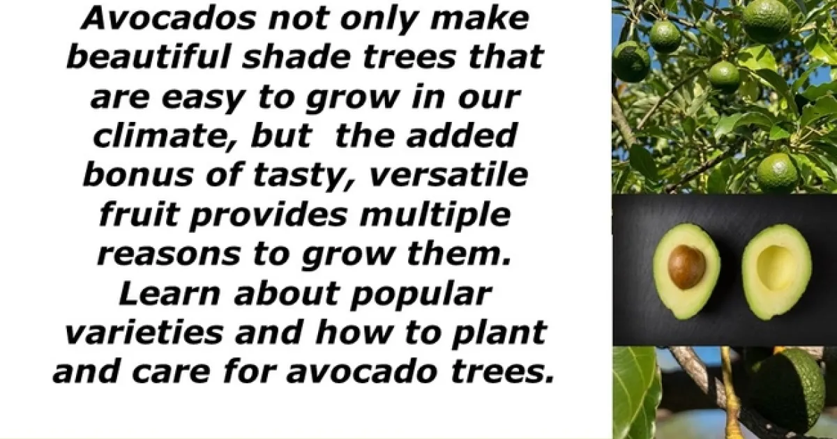 June 26, 2024 Print Avocados not only make beautiful shade trees that are easy to grow in our climate, but the added bonus of tasty, versatile fruit provides multiple reasons to grow them. Click the image to learn more and visit our Classes and Events Calendar page.