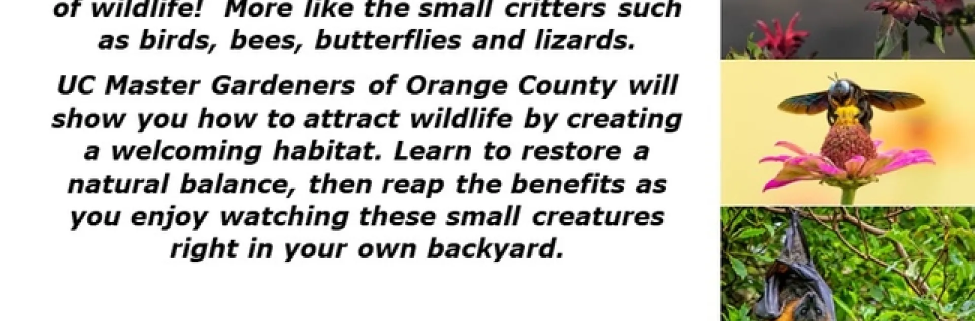No, not the lions-and-tigers-and-bears kind of wildlife! More like the small critters such as birds, bees, butterflies and lizards. UC Master Gardeners of Orange County will show you how to attract wildlife by creating a welcoming habitat.