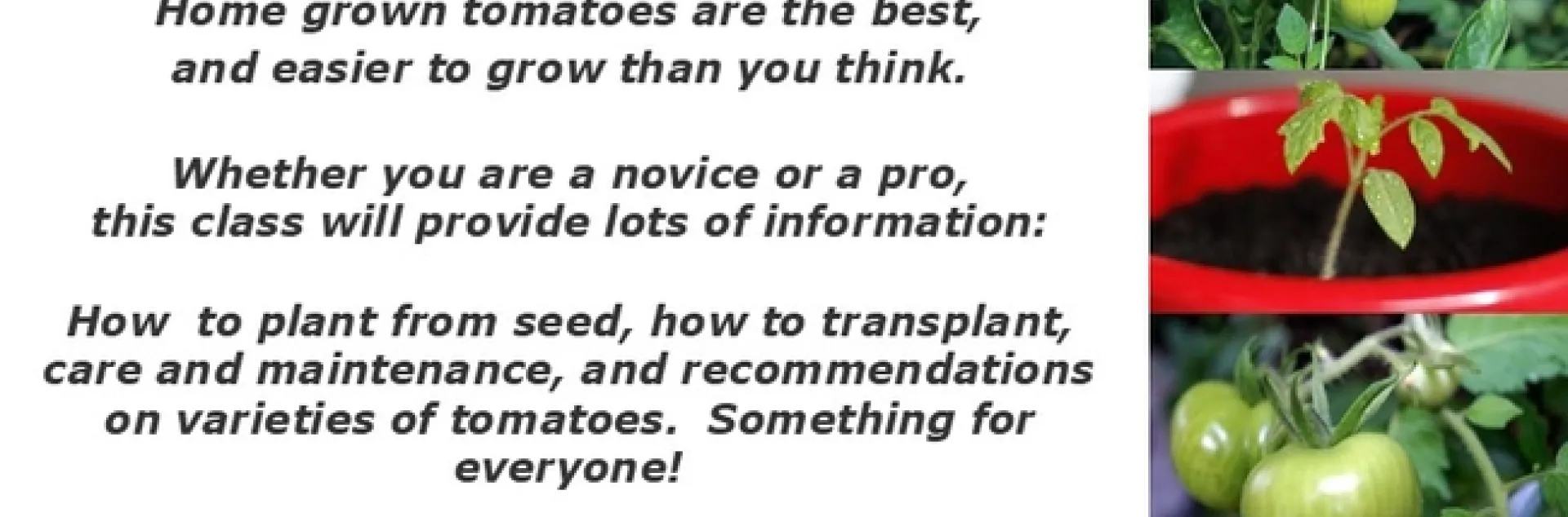 Home grown tomatoes are the best, and easier to grow than you think. Whether you are a novice or a pro, this class will provide lots of information: How to plant from seed, how to transplant, care and maintenance, and recommendations on varieties of tomatoes.