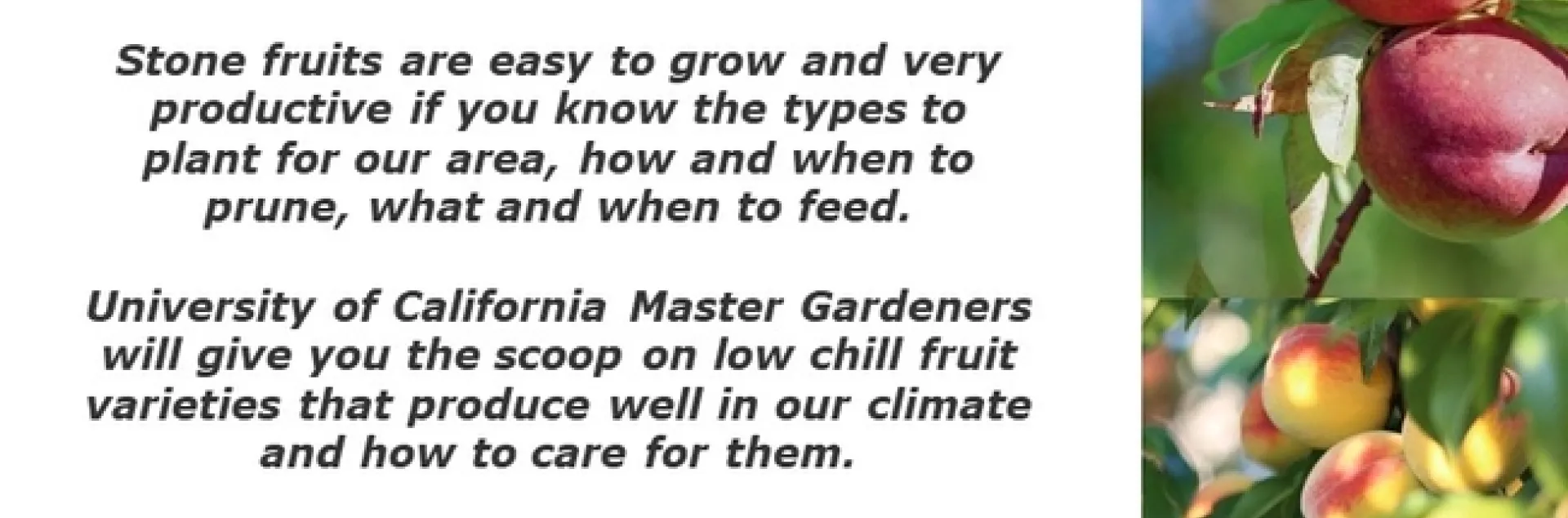 Peaches, Plums, and Apricots, Oh My! Stone fruits are easy to grow and very productive if you know the types to plant for our area, how and when to prune, what and when to feed.