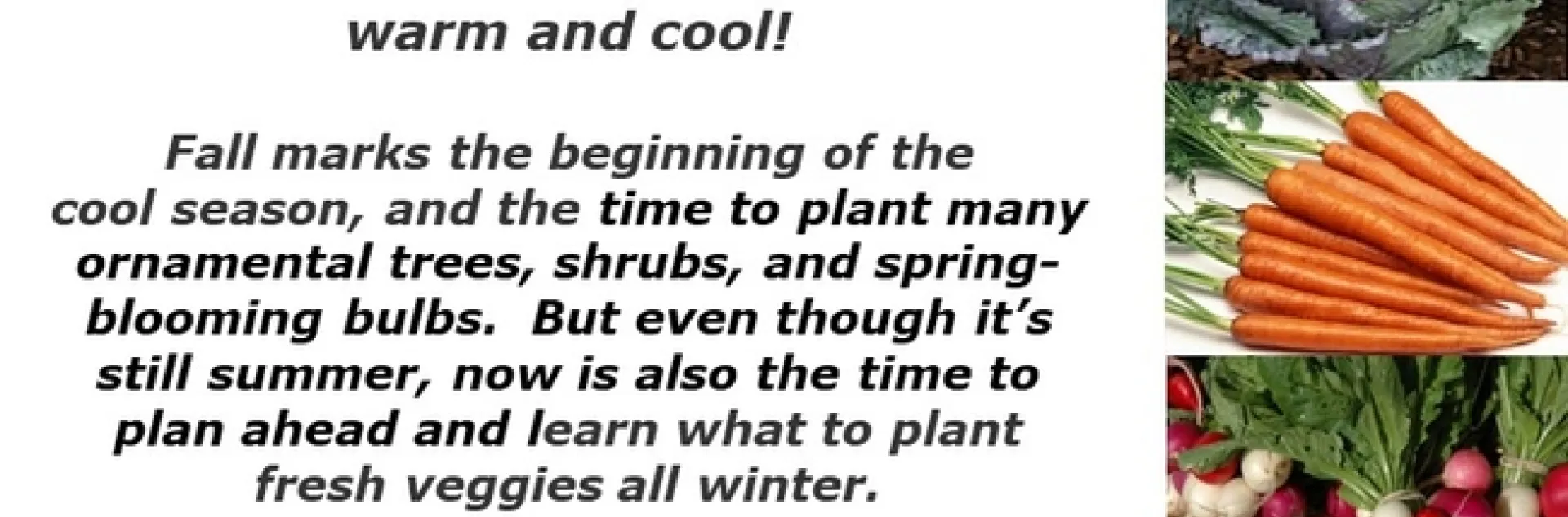 In the southern California garden, there are two seasons: warm and cool! Fall marks the beginning of the cool season, and the time to plant many ornamental trees, shrubs, and springblooming bulbs. But even though it's still summer, now is also the time to plan ahead and learn what to plant fresh veggies all winter.