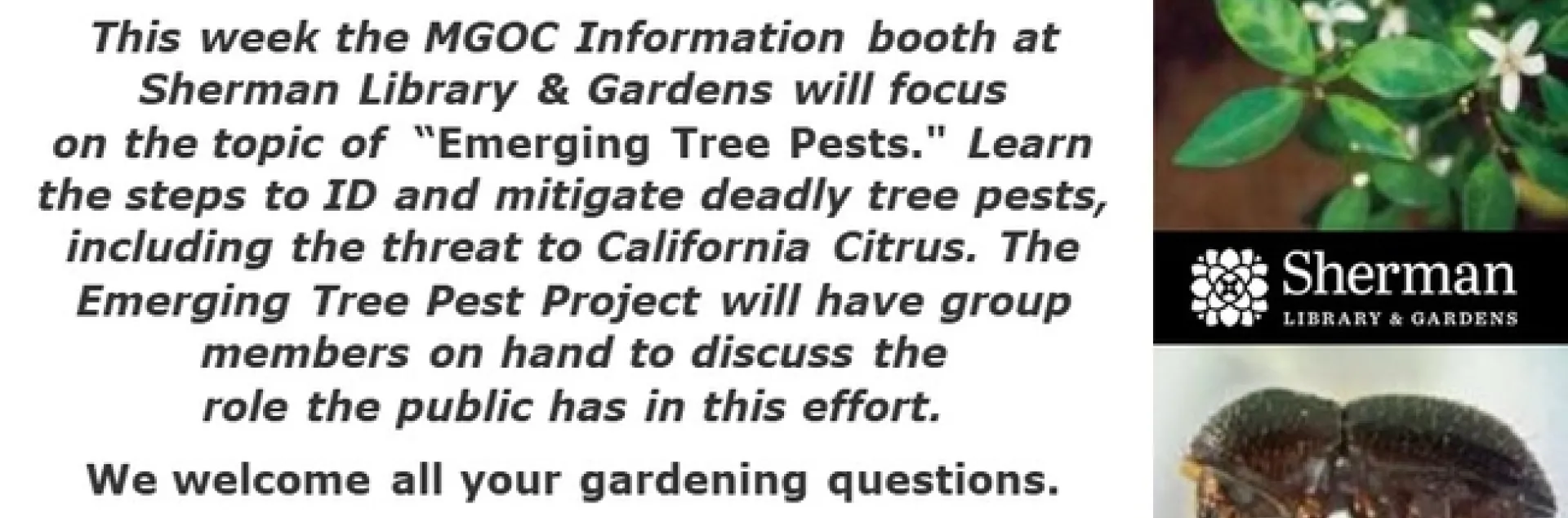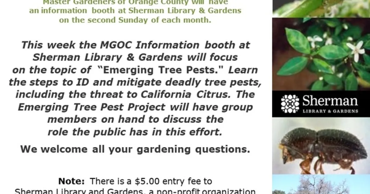 This week the MGOC Information booth at Sherman Library & Gardens will focus on the topic of “Emerging Tree Pests." Learn the steps to ID and mitigate deadly tree pests, including the threat to California Citrus. The Emerging Tree Pest Project will have group members on hand to discuss the role the public has in this effort.