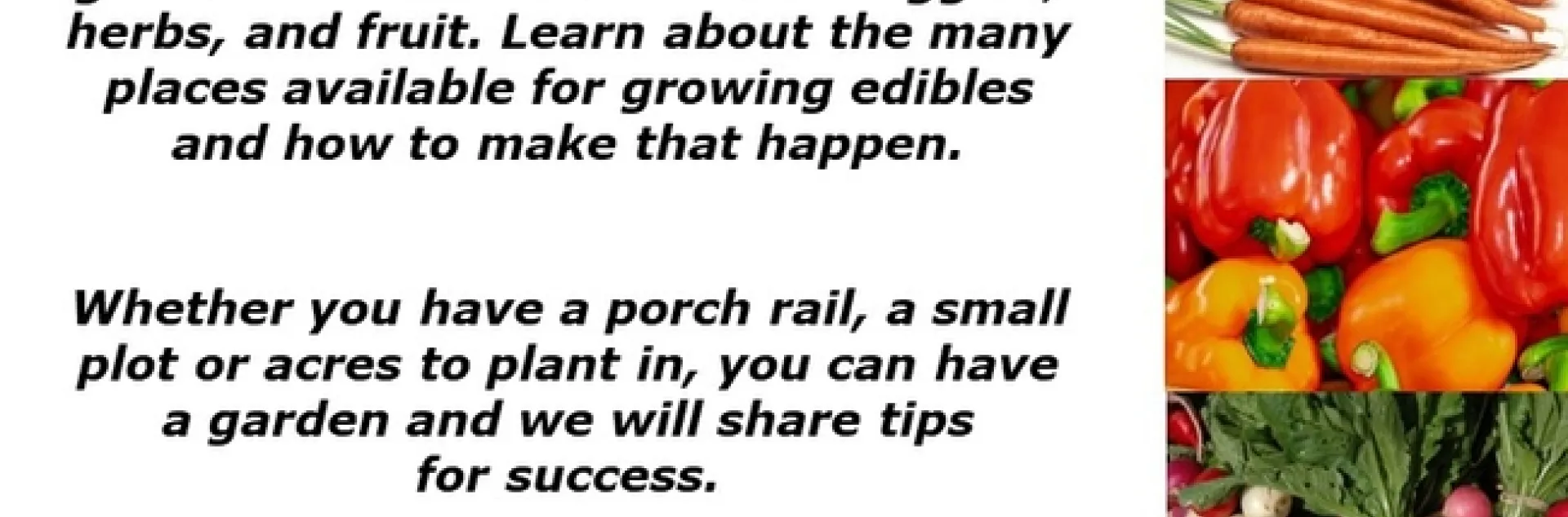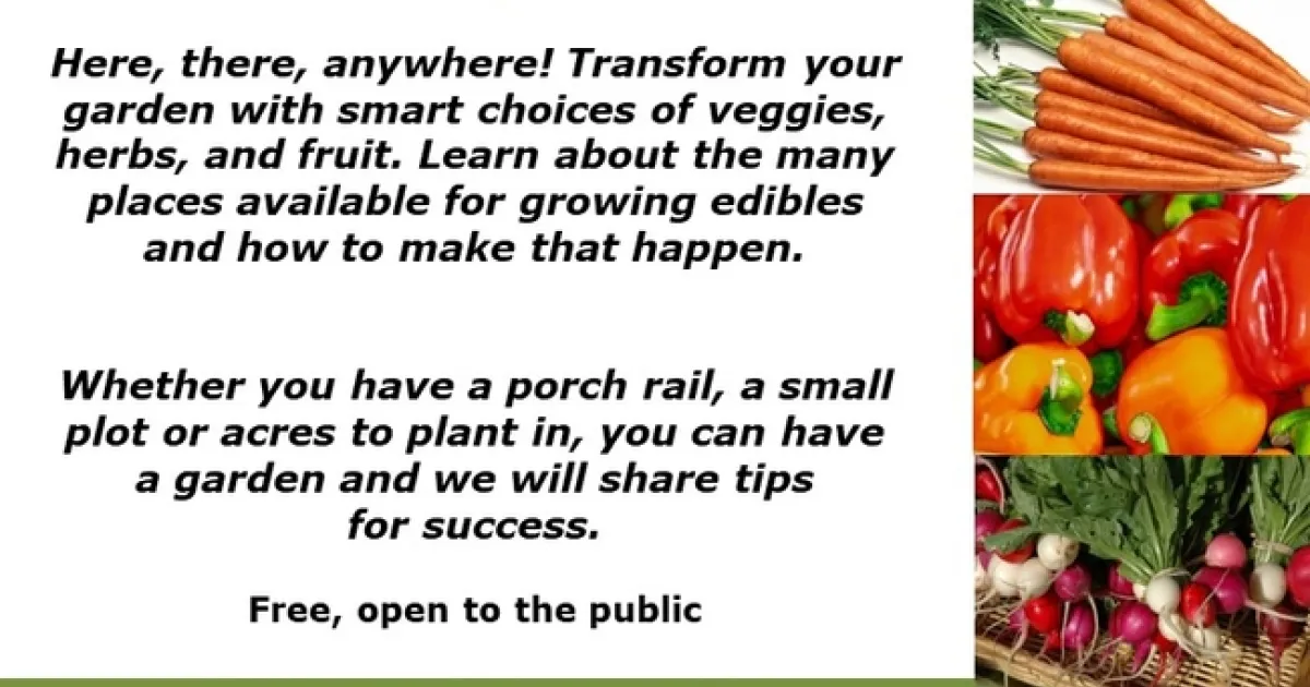 Here, there, anywhere! Transform your garden with smart choices of veggies, herbs, and fruit. Whether you have a porch rail, a small plot or acres to plant in, you can have a garden and we will share tips for success.