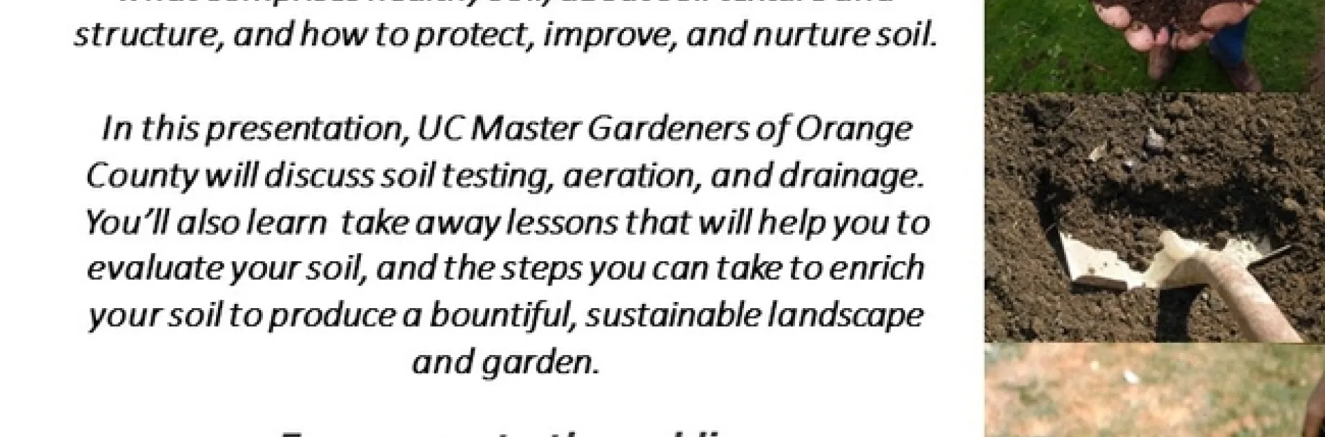 Good soil is the starting place for a great garden. Learn what comprises healthy soil, about soil texture and structure, and how to protect, improve, and nurture soil. In this presentation, UC Master Gardeners of Orange County will discuss soil testing, aeration, and drainage.
