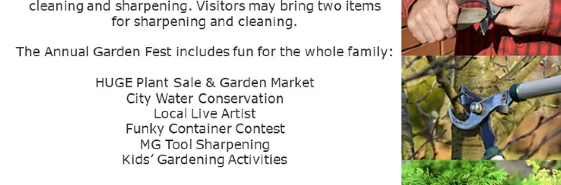 We will demonstrate "hands-on" tool cleaning and sharpening. Visitors may bring two items for sharpening and cleaning. The Annual Garden Fest includes fun for the whole family. HUGE Plant Sale & Garden Market.