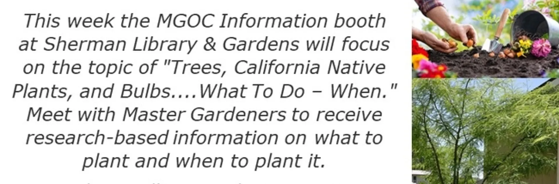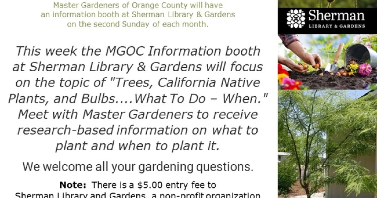 We will have an information booth at Sherman Library & Gardens on the second Sunday of each month. This week the MGOC Information booth at Sherman Library & Gardens will focus on the topic of "Trees, California Native Plants, and Bulbs....What To Do – When."