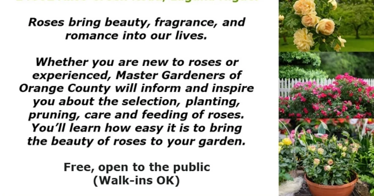 Roses bring beauty, fragrance, and romance into our lives. Whether you are new to roses or experienced, Master Gardeners of Orange County will inform and inspire you about the selection, planting, pruning, care and feeding of roses. You'll learn how easy it is to bring the beauty of roses to your garden.