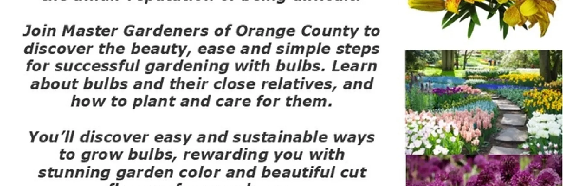 Bulbs add beauty to any garden but have the unfair reputation of being difficult. Join Master Gardeners of Orange County to discover the beauty, ease and simple steps for successful gardening with bulbs. Learn about bulbs and their close relatives, and how to plant and care for them.
