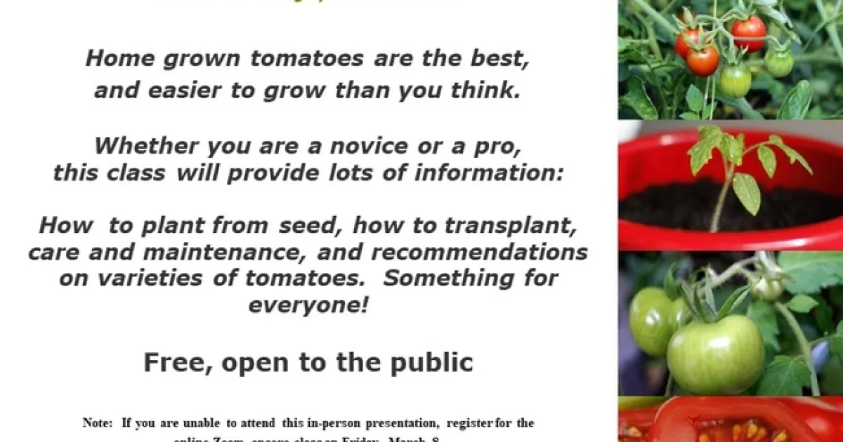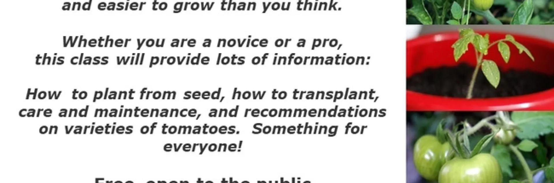 Home grown tomatoes are the best, and easier to grow than you think. Whether you are a novice or a pro, this class will provide lots of information: How to plant from seed, how to transplant, care and maintenance, and recommendations on varieties of tomatoes. Something for everyone!