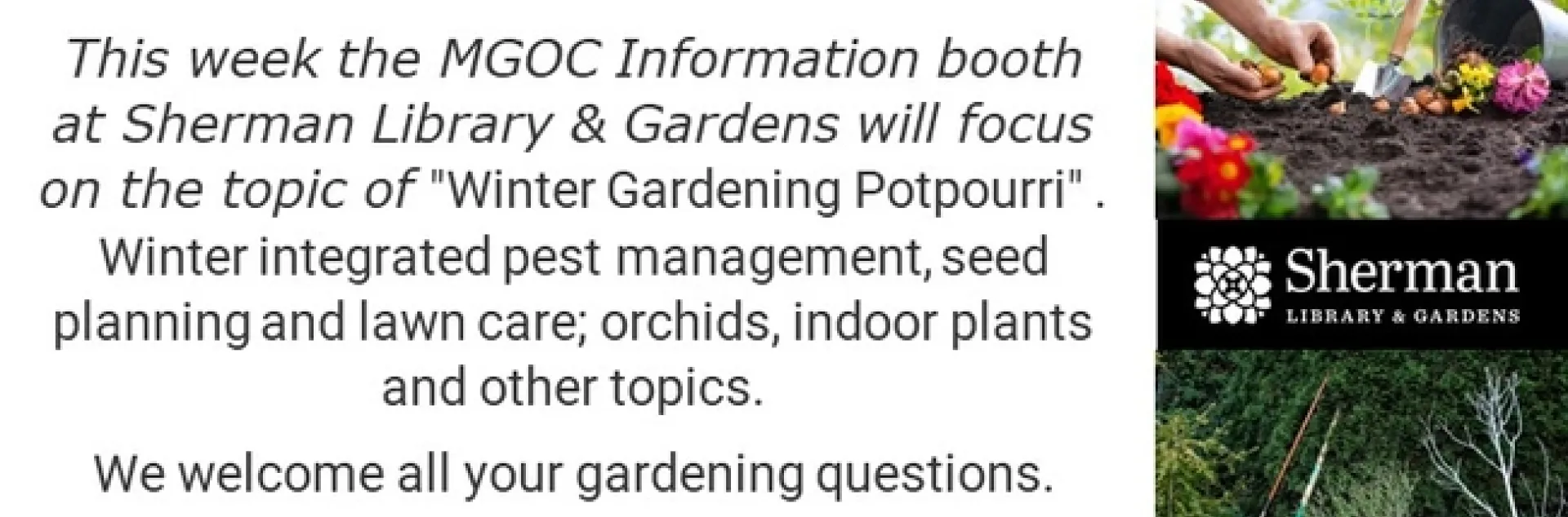 We will have an information booth at Sherman Library & Gardens on the second Sunday of each month. This week the MGOC Information booth at Sherman Library & Gardens will focus on the topic of "Winter Gardening Potpourri".
