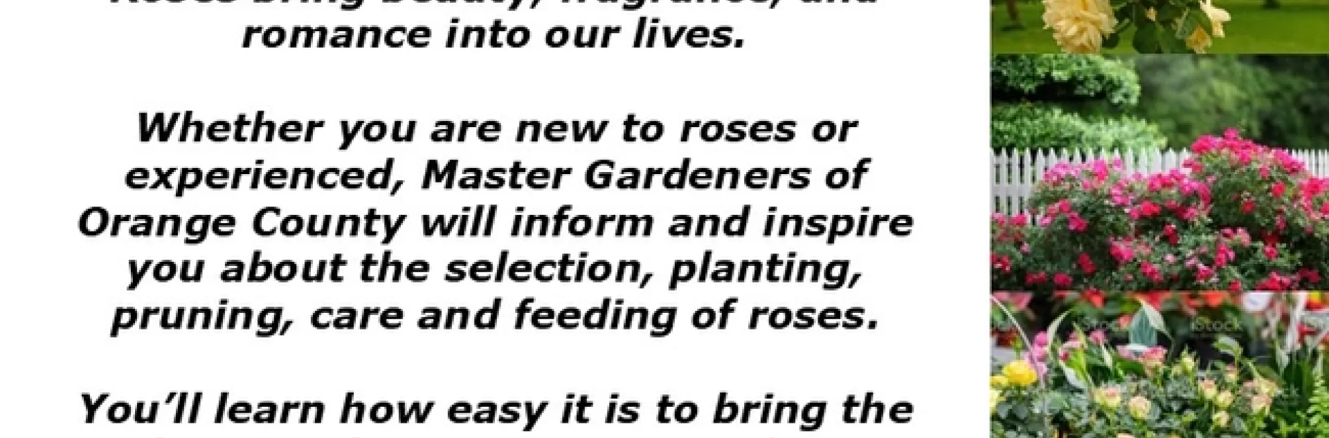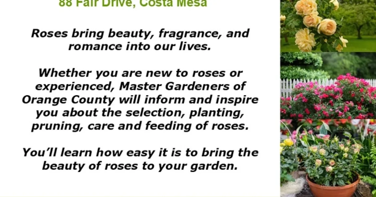 Roses bring beauty, fragrance, and romance into our lives. Whether you are new to roses or experienced, Master Gardeners of Orange County will inform and inspire you about the selection, planting, pruning, care and feeding of roses.
