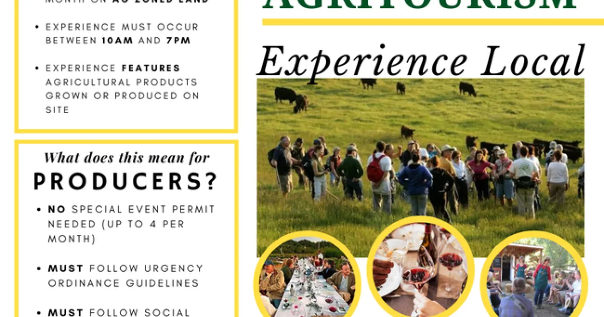This is great news for operations looking to offer agricultural experiences. Under the ordinance, agricultural experiences can now occur without obtaining a Special Events permit from Permit Sonoma, saving time and money!