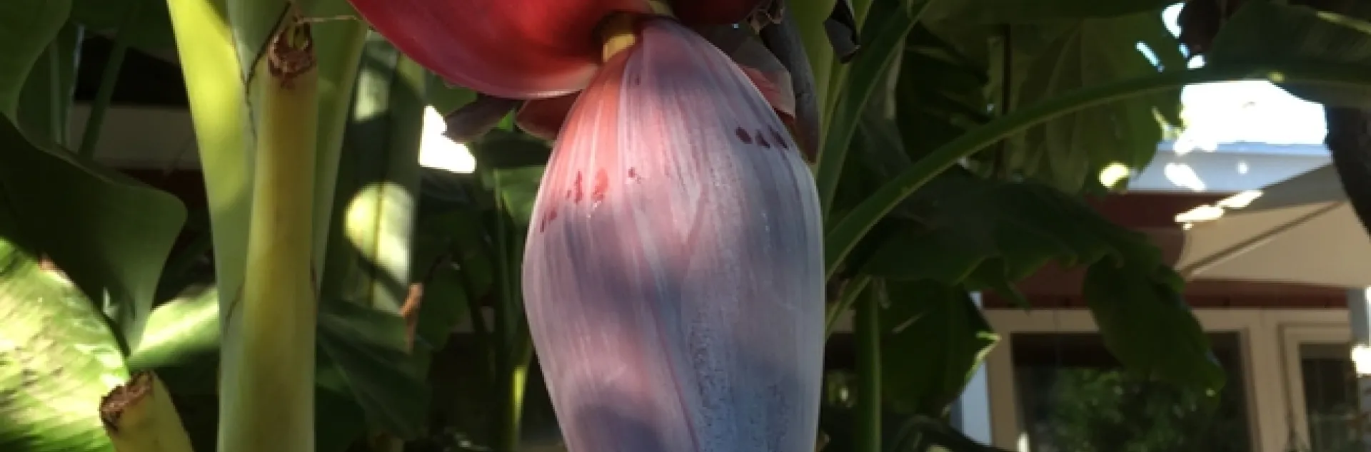 The banana (Musa) is not a tree. It is a fast-growing herbaceous plant with a thick, but soft, pseudostem that is actually the unfurled leaves. It spreads underground by corms. Rich soil with a pH of 6, amended with compost and mulch, as well as a warm, humid coastal site free of leaf-tattering wind is the ideal set-up. Several sources suggest planting them near a south wall. (My dad's tree is against the south wall and protected from the wind.) Soil needs to have good drainage as plants can develop fusarium wilt. Still, they are tropical plants and need a fair amount of water during the hot months. It is recommended to check the soil, and if it is dry ½ inch down then water is needed. Frost does damage them, but they rebound in spring in our climate. In their native habitat, bananas will take 6-9 months to flower and then another 2-3 months to have ready-to-pick fruit.