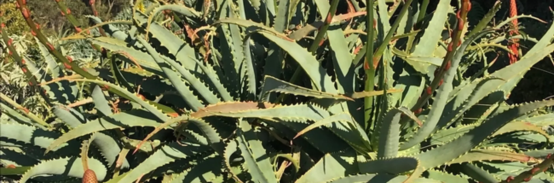 Aloe arborescens is putting on a show for the holidays this year. Endemic to south eastern Africa, this aloe is also known as Candelabra aloe which easily describes the elegant plumes of orange which are very attractive to wildlife seeking sweet nectar. Another common name is krantz aloe. Krantz is from the Afrikaans word ”krantz” meaning rocky outcrop. This popular aloe can be found growing at sea level up into mountainous outcroppings. In southern Africa farmers frequently used this aloe as a living fence around their animal enclosures. I saw a similar use of cacti in Aruba years ago.