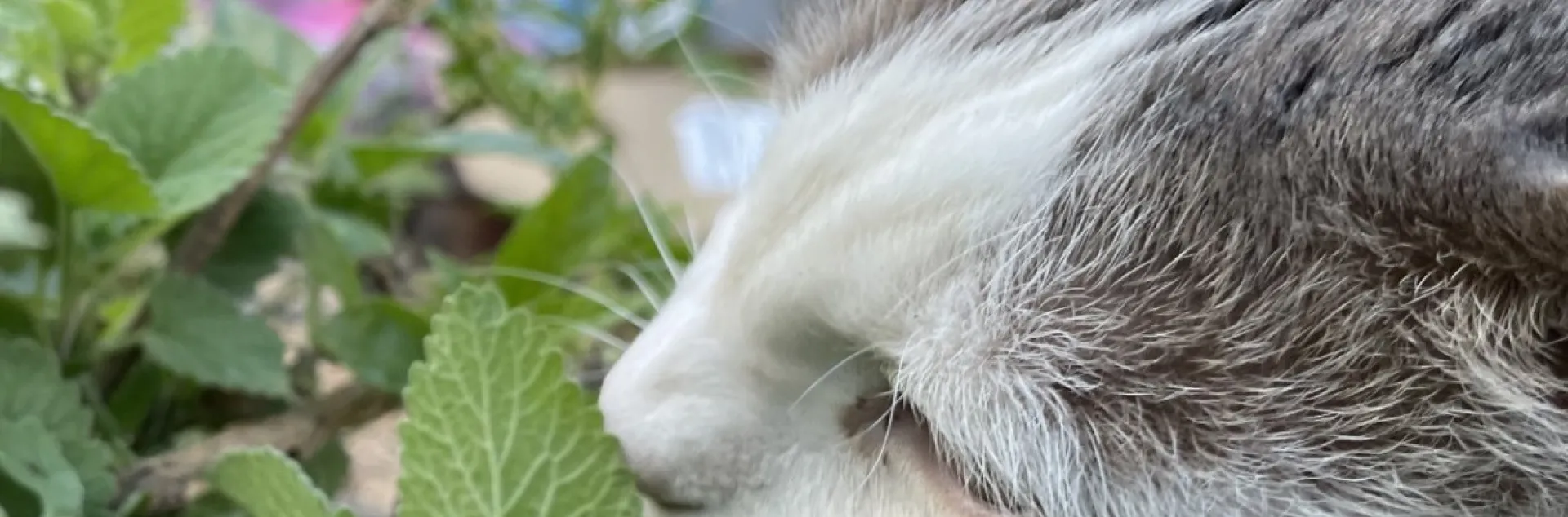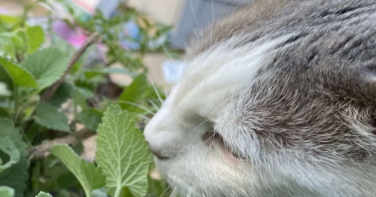 It’s the chemical neptalactone that attracts the vomeronasal gland (olfactory and taste sense in the roof of the mouth) of cats. Some cats just like to smell it, but Snugs loves to eat it. Snugs shares his bounty with his neighbor cat friends, who sneak over for snacks.