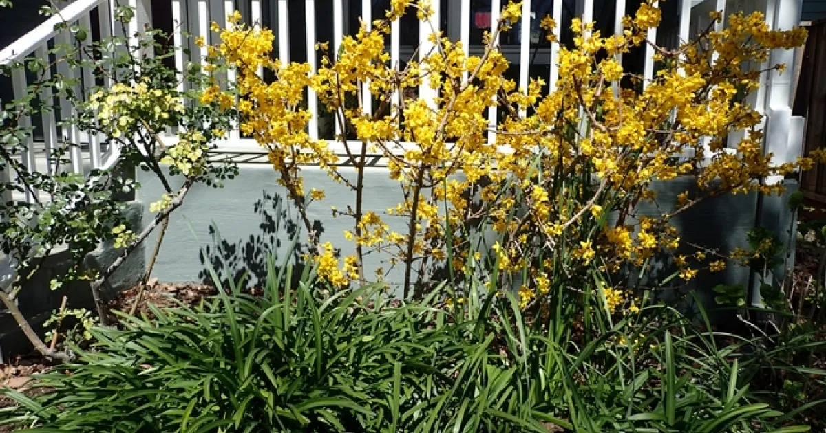 2) Blooming Forsythia hedgerow in front of the raised porch