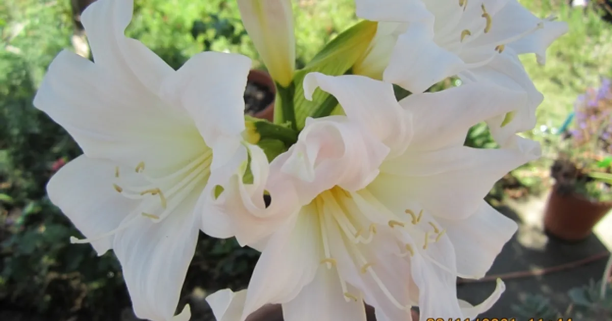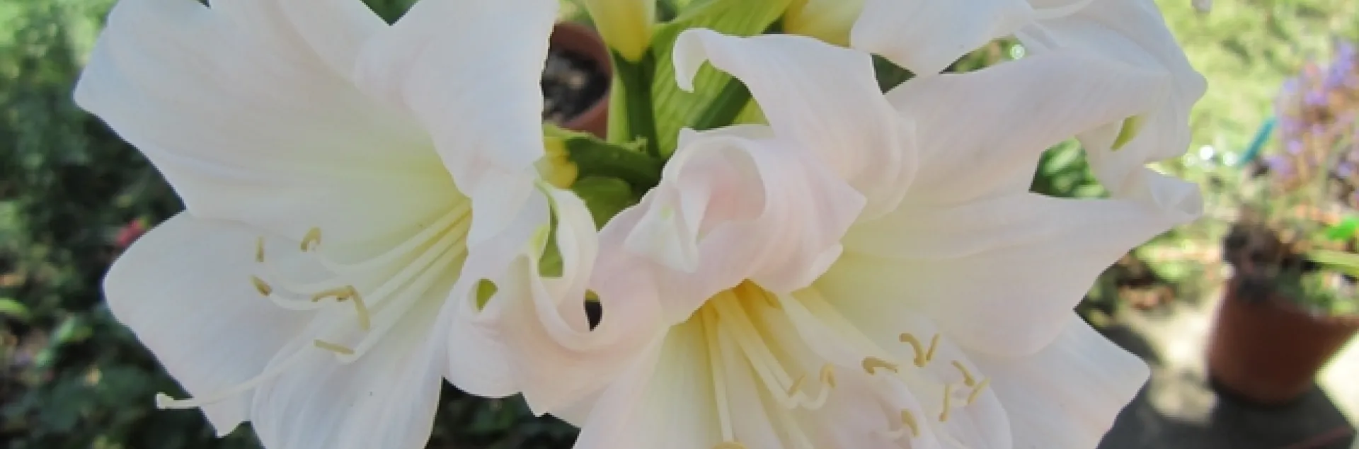 This spring, I realized that these bulbs had acclimatized and were actually growing; from one pot was growing a thin green shoot – since I live in the “wind belt” of Suisun City, I carefully moved the pot away from anything that might brush against it and bend it. From the pot, next to it, a very thick, hefty shaft was growing slowly upward; this was the year that I would finally get to see these plants blossom. One of them is white with a slight pink tinge and the other is supposed to be a deep rose-red AND it only took 3 years to do something. Go, team!! The third bulb is still just sitting in its pot, do absolutely nothing but drinking water and using the fertilizer nutrients!