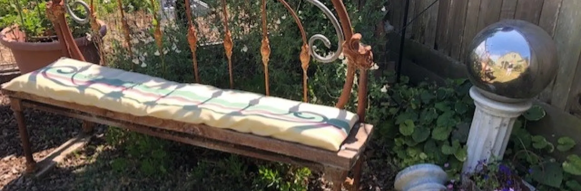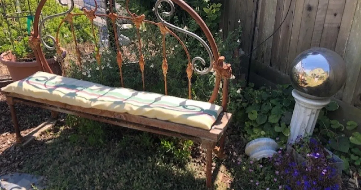 My favorite find and upcycled project is an old iron bed frame that my husband and grandson made into a garden bench.  The piece cost $20 at a garage sale, and we spent a few bucks purchasing an 8 X 12 redwood board and some big lag bolts to fasten it to the bed legs.  They cut the side rails short, attached the legs to the front of the board, and were finished in no time at all. The grandkids loved building things with Gramps and working in the garden with Grandma Kathy, so we cherish the memories of those fun times whenever we see the little bench that graces a corner of our garden.  Over the years we added slate paving stones and creeping thyme (Thymus praecox) in on the ground in front of the bench to make it a more pleasant place in which to sit. It is a hardy groundcover but does attract bees, so allergies must be considered.