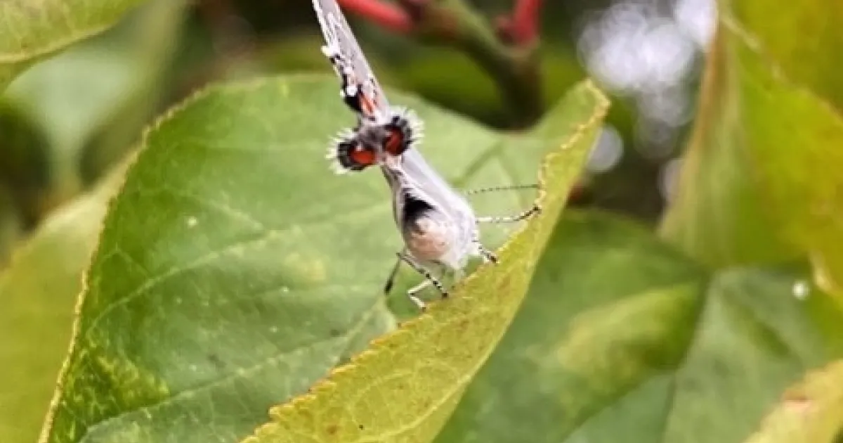 That funny “face” is actually not a face at all.  Like many other butterflies, the Gray Hairstreak is designed to fool predators into mistaking its tail for its head.  When it is perched with its wings folded, the eyespots and “tails” look like a head. This may fool birds, lizards, and spiders into attacking the wrong end.  For the rest of us, it may simply be entertaining!