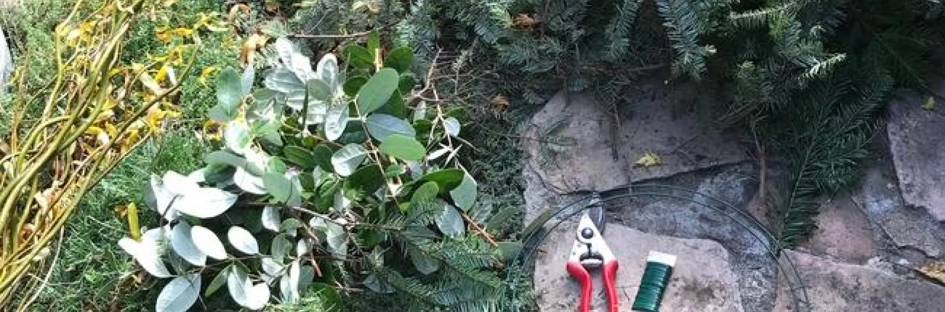 We have found that cutting branches into 12–18-inch pieces seems to work best in wreath making. I'll try and soak the freshly cut greens in water for 20 minutes before I start actually putting the wreath together. Paddle wire needs to be attached to the wreath form. Next clusters of greenery are attached to the frame with the paddle wire, overlapping the bundles until you have covered the whole frame. How close together you place the bundles affects how full your wreath will be. If you don't have enough greenery or branches to make a complete wreath you might want to consider adding things from your garden to a purchased wreath, it can really liven it up.