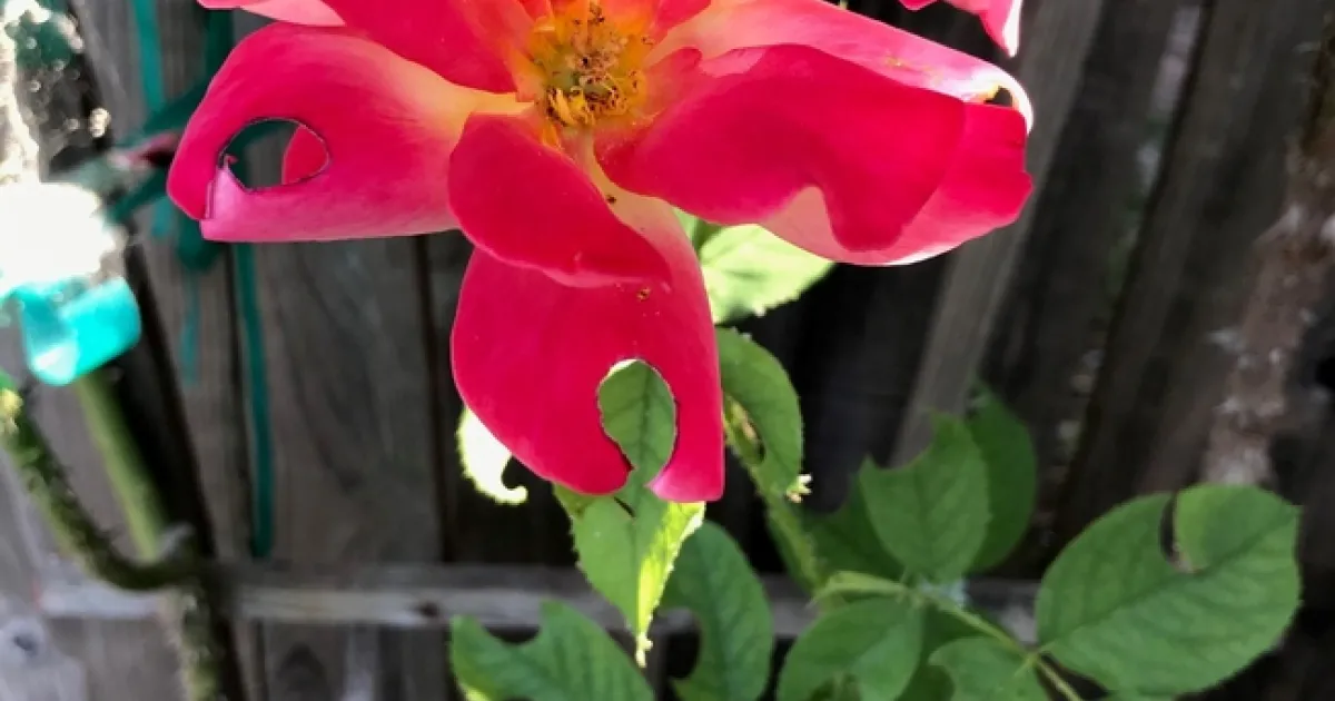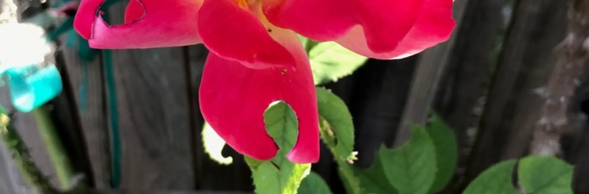 Over the years I had gotten used to the leaf damage. But it was the petal damage this year that really gave me pause. How could I mentally re-frame the shape of the damaged rose blossom? I realized that if this shape was on a new variety of dahlia or passionflower, I would think it was very exotic and embrace it. So, I've decided to embrace it on my rose as well.