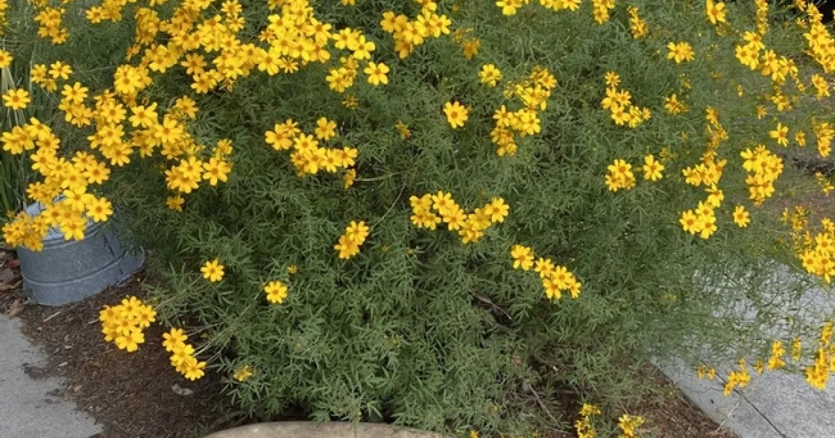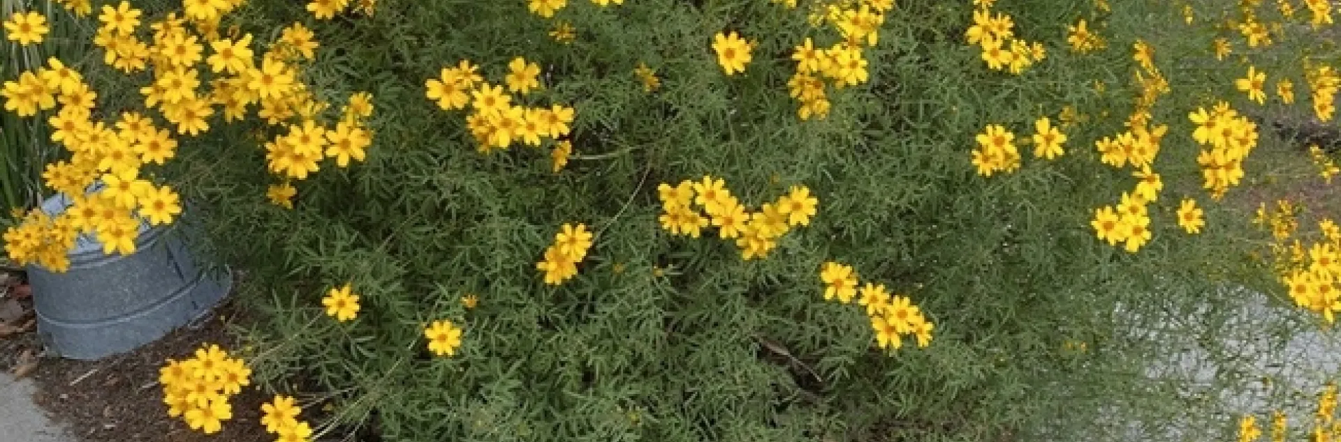 The Mexican Marigold is an evergreen shrub 4'x6' with 2” bright yellow daisy- or marigold-like flowers.  It is native to southern Arizona and northern Mexico.  The shrub provides its best display in the short days of fall and winter and may extend its display into spring in overcast weather.  It will continue to bloom, but to a lesser extent, in other seasons.