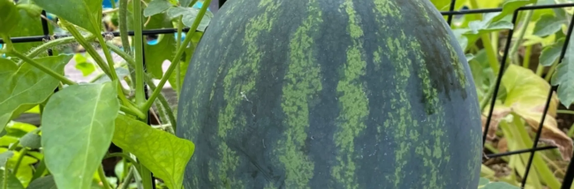 This year, in a triumph of hope over experience, I decided to try another type of melon, a watermelon. I've tried growing watermelons before but was wholly unsuccessful. But this time, I tried to be strategic. I selected the ‘Mini Love' variety because it has small fruit (5-7 lbs) and a shorter period to reach maturity (70 days). I didn't think I could plan on a long, warm growing period required for other larger varieties. There were lots of options from which to choose, so the description of ‘Mini Love' as holding well in the field weighed in its favor. We get busy in the summer, and the odds of missing the optimum harvesting window are high.