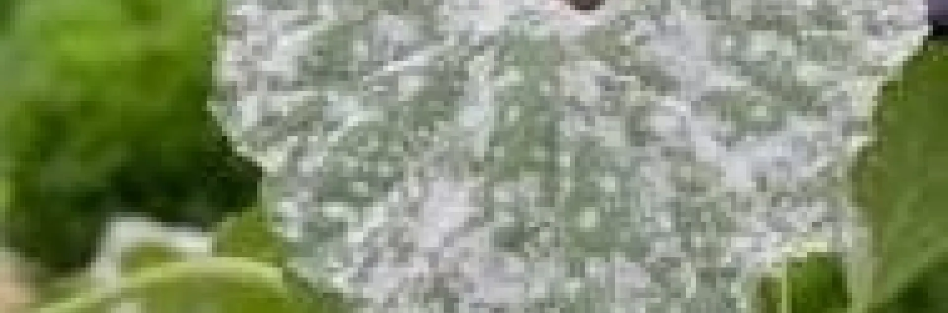 A bit about this pesky pathogen. Powdery mildew is the name bestowed upon a disease caused by two closely related fungi (Sphaerotheca fuliginea and Erysiphe cichoracearum). Yellow spots first appear on stems, petioles, and leaves, enlarging as the mycelium grows and produces spores, thus the powdery appearance. If not removed or mediated, the plant will take on the desperate look described above. Unfortunately, this can happen any time of the year, but crops are especially at risk when the humidity is 50 to 90%. S. fuliginea prefers warmer weather while E. cichoracearum flourishes in cooler weather.