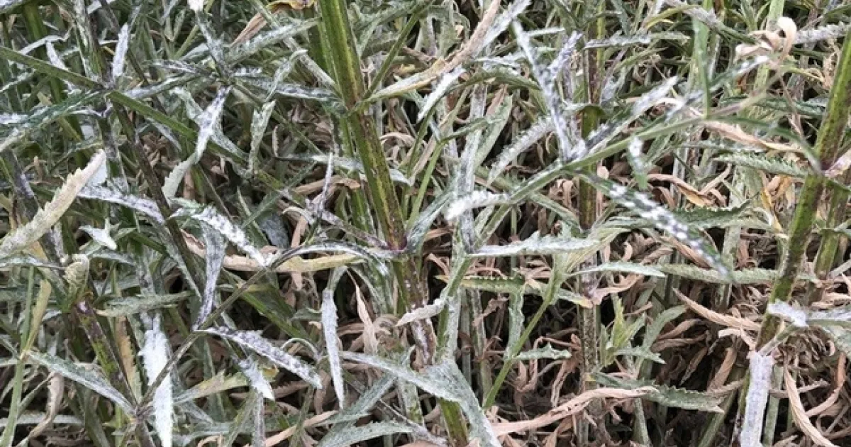 Powdery mildew appears as – no surprise - white, powdery patches on leaf surfaces and stems. Powdery mildew on verbena can also result in a purpling and chlorosis (yellowing) of the upper leaf surface. The lower leaves generally are the first to show symptoms.