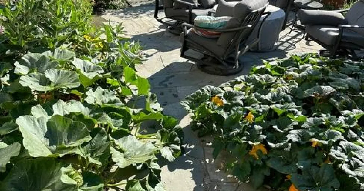 The whimpering? Well, the two massive pumpkin vines have met and are nearly touching. My 105-lbBernese Mountain dog was trying to follow me to the back door and he was afraid to walk through the 6” gap between them. He is a big baby who is afraid of many things and now we will add pumpkin vines to the list.