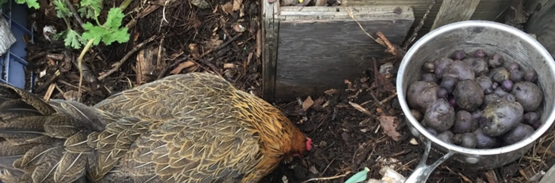 I grabbed my garden fork and started digging. With help from my garden assistant chicken, Brownie, I dug, she scratched, until we were both exhausted. We got multiple sizes from medium-sized potatoes to bead-size pieces. When we were done, I had enough potatoes to mash for two meals.