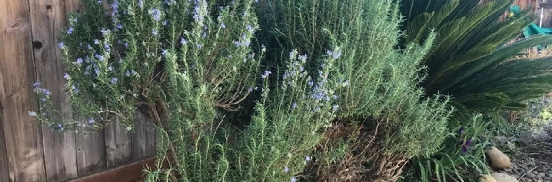 I was in charge of cutting the rosemary.  I avoided the left side of the shrub because it didn't have branches that were long enough for a wreath, possibly from being pruned last year. So, I cut extensively on the right side.  That December pruning, never an optimal time, stimulated branch and leaf growth, but at the expense of early spring blossoms. Because the left side hadn't been touched, it had beautiful flowers.  Because rosemary is so hardy, I expect the right side to bloom later in the season.